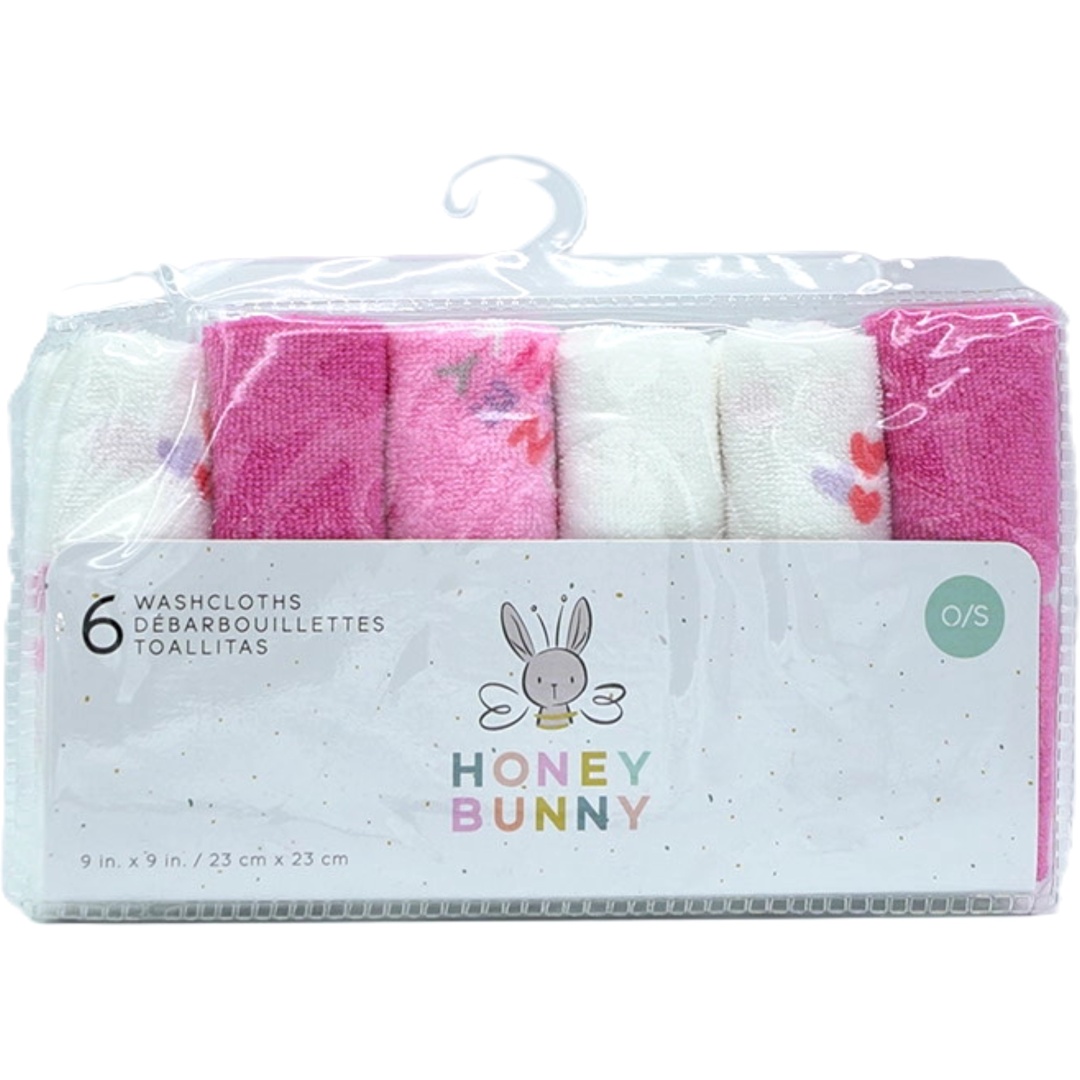 Washcloths 6pk. 9 x 9" Pink & White Honey Bunny"